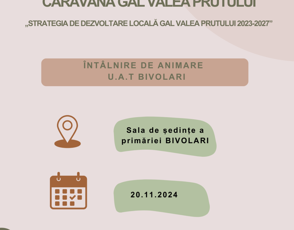 Miercuri, 20.11.2024, începând cu orele 09.30, echipa tehnică a GAL Valea Prutului va fi prezentă în Sala de ședințe a comunei Bivolari pentru a prezenta oportunitățile […]